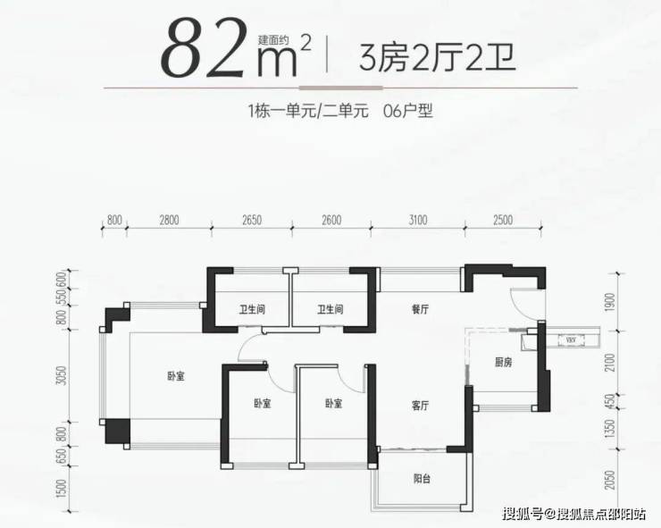 82㎡的3房2厅2卫,03户型,设计的是竖厅格局,进门独立玄关,LDKB一体化,S墙设计预留冰箱卡槽位,主卧双飘窗设计,L型厨房,卫生间干湿分离,得房率约100%(包含赠送),西南朝向。