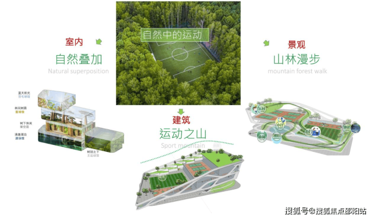 在建筑、室内、景观设计中分别融入了“运动之山”“自然叠加”“山林漫步”的设计思想,合理满足各种运动功能需求。