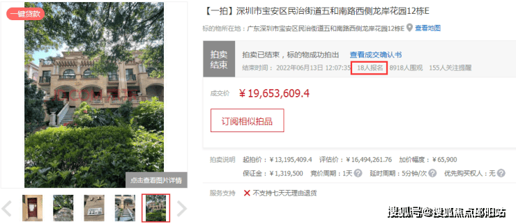 此次将要推出的42套别墅是之前的保留单位。今年6月龙岸曾法拍一套218.78㎡的房源,当时起拍价1319万,吸引出18个人报名。经过75次出价,最终拍到了1965万,折合下来,单价近9万/㎡!