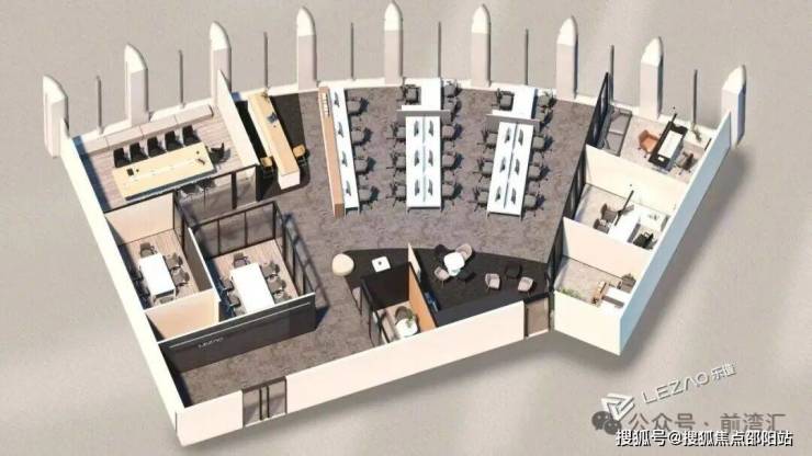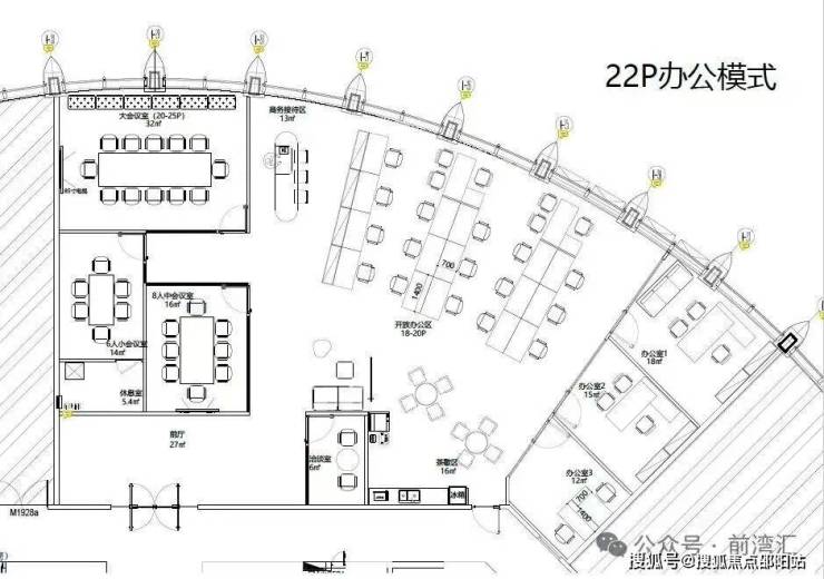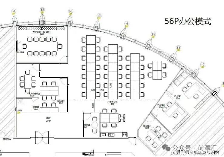 格局:18工位+4会议室+3办公室,有茶水间(最多容纳56人)