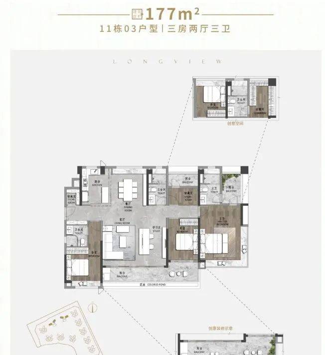 三开间朝南,开间达 6 米,餐客厅面积 50 平,空间宽敞大气 。16 米长的 270 度转角大阳台,视野开阔 。大主卧带 10 米转角飘窗,彰显尊贵 。总价 960 万起,是追求高品质生活的高端改善客户的理想选择 。