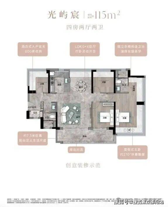 115㎡的4房2厅2卫,设计的是竖厅南北通透格局,进门入户玄关,客厅4.45米开间,餐客厅分离设计,分别做到了主卧23.45㎡/次卧8.96㎡/次卧7.84㎡/次卧7.68㎡(实测面积),客厅连接次卧出10.87m²的观景大阳台,L型中式+岛台灵动式厨房,公卫三段式干湿分离,得房率约78.27%(不含赠送),阳台主朝东南或西南向。靓点:南北对流+7.25米长超大观景南向阳台,超大主卧+270°无柱转角飘窗+进门独立玄关800库。