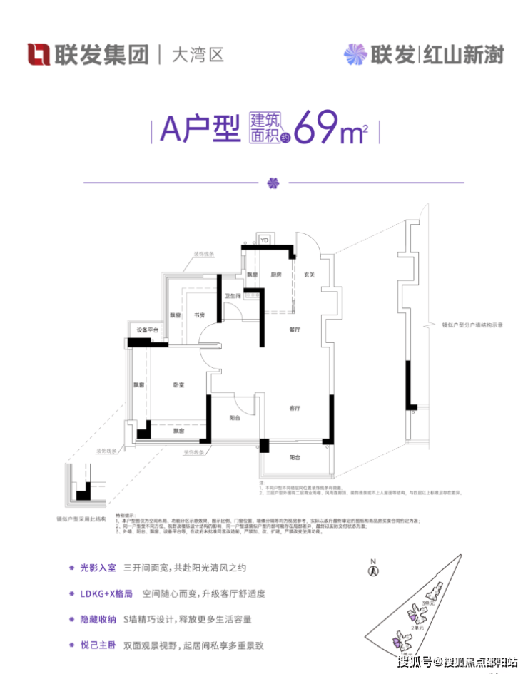 红山稀缺小面积三房,得房率近 100%。竖厅 LDKG 一体化,三开间朝南,西南向采光足。S 墙预留冰箱位,U 型厨房动线流畅,三段式干湿分离卫生间。双飘窗 + 设备平台可拓展,空间灵活实用。价格:折后约6.1-6.7 万 /㎡,总价约425-466 万。