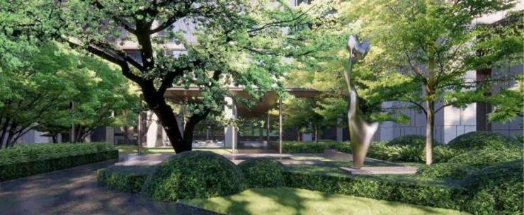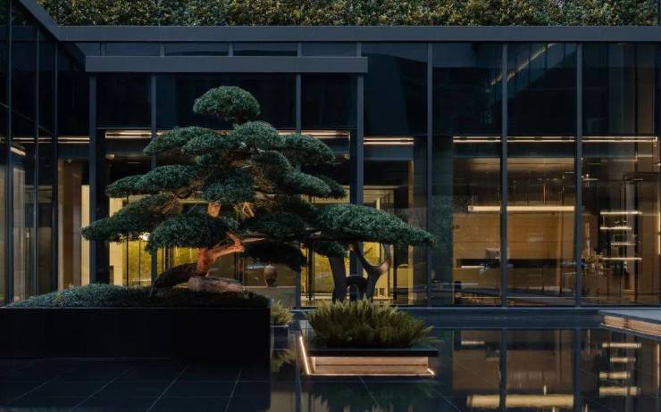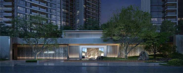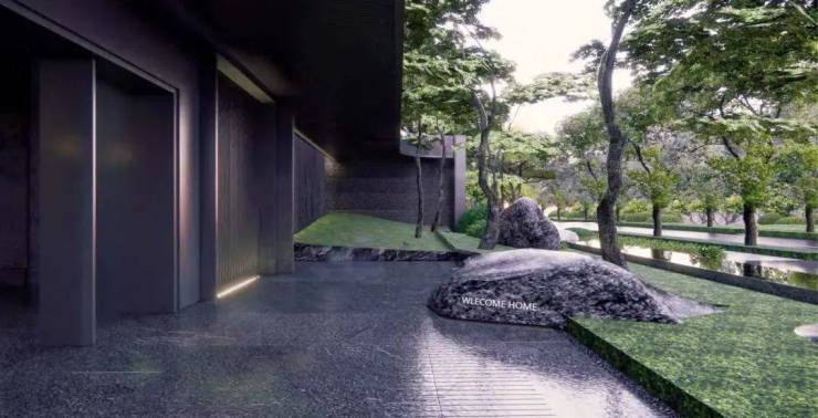 入口50米横向面宽,近6米的高跌水景墙与双层门楼让回家有了一份尊贵与隐奢;随着动线穿林,见山,伴水,来到模仿山石色调与铜色金属融合打造的酒店式大堂,一路草木清香、青石铺地、水系流动,自然的隐奢之美扑面而来。