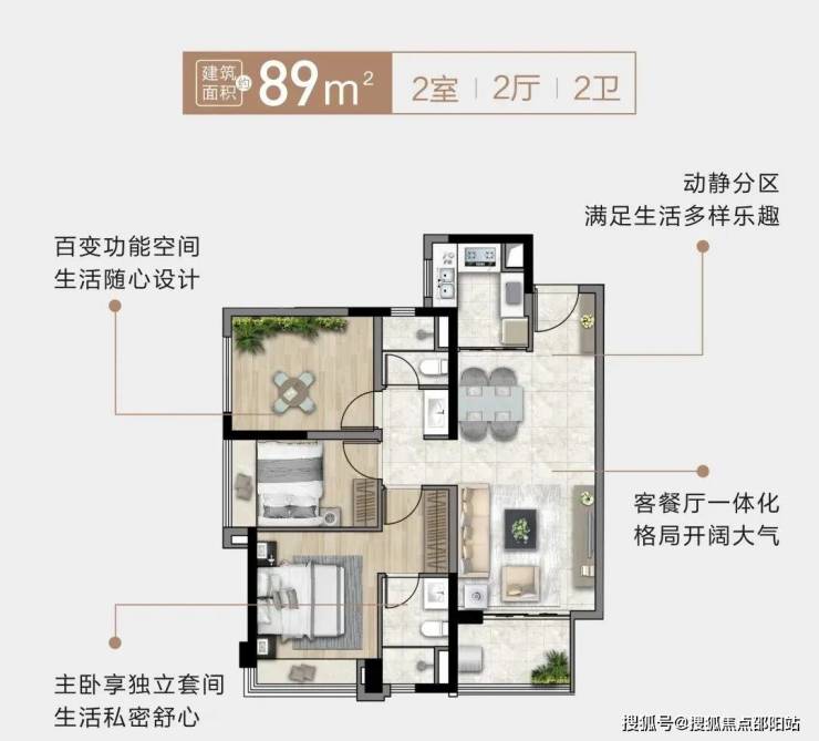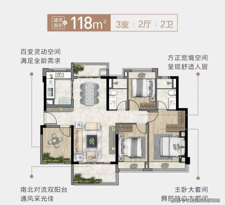 拥有南北通透双阳台,让居住空间更显大气。双主卧套间设计,采用南向全飘窗,细节之处彰显主人尊崇。超高的使用率,功能上回归家庭,布局上强调平衡,让空间更实用。
