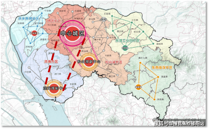 2023年,东莞将形成“一主两副六片区”格局。中心城区是唯一的主中心,滨海湾、松山湖将成为城市副中心。滨海湾将以科技创新为主要职能,其资源要素配置紧紧围绕科技创新这一核心职能进行,体现制造立市的城市特征。