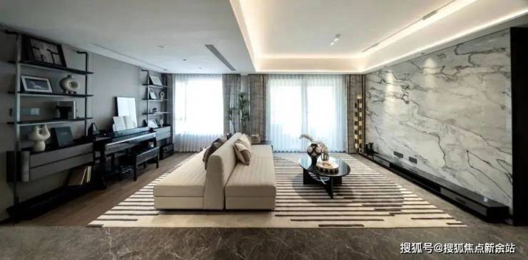 样板间将客厅与客卧打通成近50㎡的大方厅,空间十分阔绰,由于该户型的实用率高,且几乎没有走廊造成空间的浪费,室内的观感足以媲美市面上的130㎡户型,不会有哪个空间显得特别狭小。