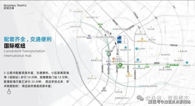 项目西侧隔双界河是宝中,从项目出发乘坐1-2站地铁或驾车10分钟左右可达宝安图书馆、少年宫、湾区之眼、滨海艺术中心和宝体。