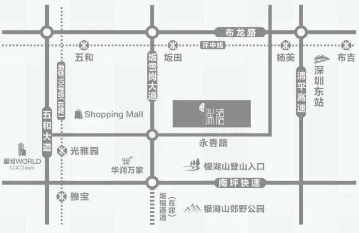 “两横四纵”成熟交通路网体系(两横:布龙路、南坪快速;四纵:五和大道、坂雪岗大道、梅观高速、清平高速);邻近地铁5号线坂田站和10号线光雅园站;地处坂银通道首排,约12分钟直达福田中心区,建立起快速通达全城的半小时生活圈