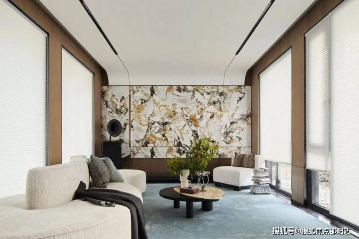 遵循注重自然感知与现代美学的至简之道,两侧落地窗把海岸景观最大化呈现,180°景观视野,超宽尺度让自然的气息轻盈流淌,温柔地裹挟每一处角落,天然的大理石材透着金色的纹理与微光,与上下一深一浅的色调对比增强空间层次感。
