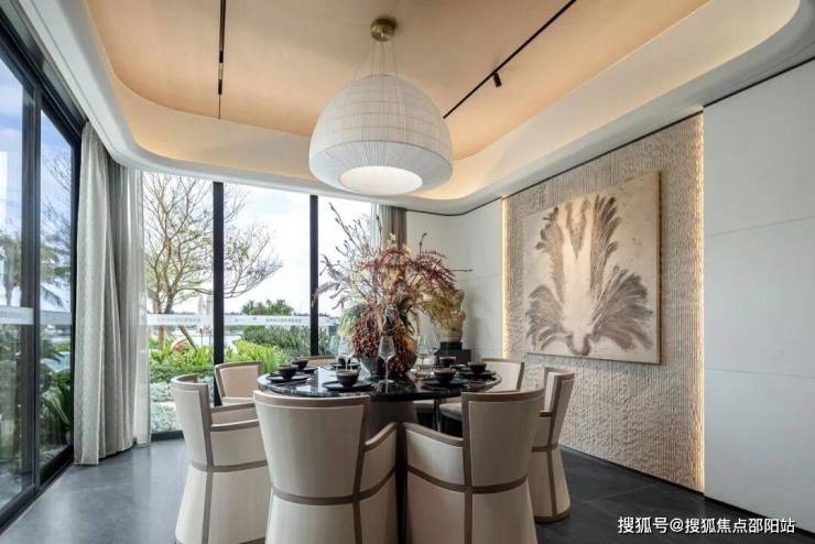 大幅落地窗模糊室内外界限,客厅独享静谧广阔的超宽视野,面朝大海,伴着海浪随风飘来的私语,开启不同聚会场景下的生活状态。
