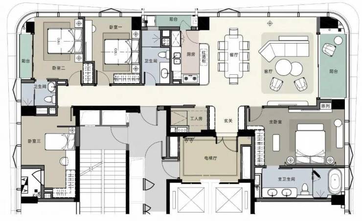 太子湾·鲸域作为公寓产品,具备了十分完善的居住功能,阔绰全功能主卧套间+父母套间(客人套间)+小孩套间+工人房,家族大宅的尊崇顶配,使产品的豪宅属性提高了一个档次。