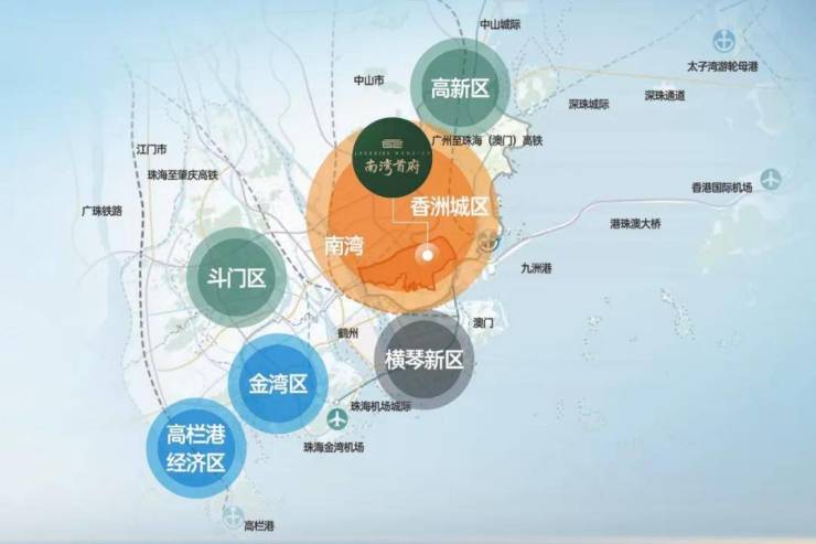 ▫南湾位居珠海地理几何中心,东面一桥之隔即为香洲老城区,南面与横琴粤澳深度合作区、十字门中央商务区一山之隔;西面规划鹤州新中心;