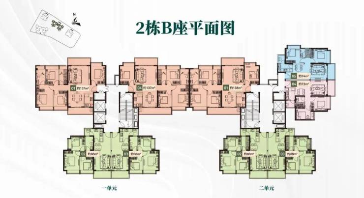 2栋B座一单元01、04户型、2栋B座二单元01户型:面积约为137-138㎡的4房2厅2卫