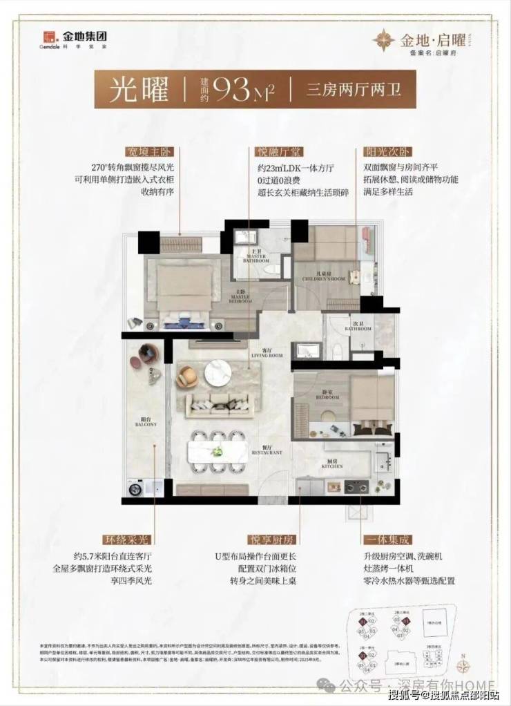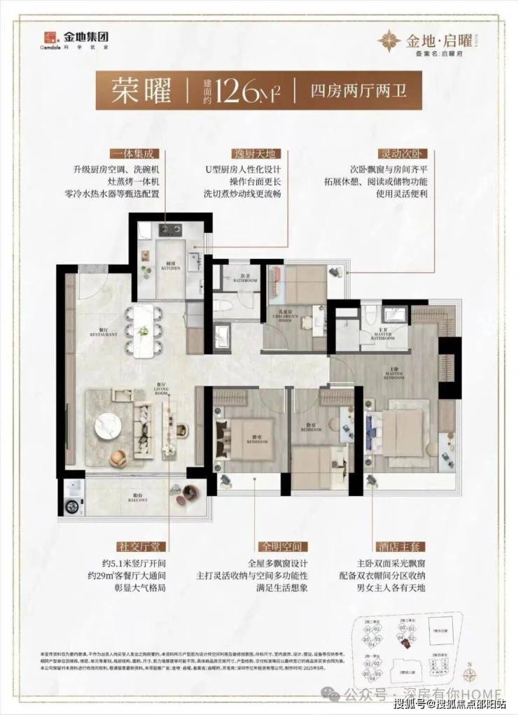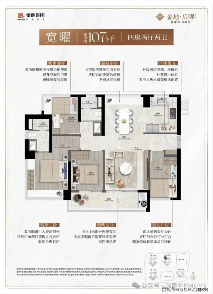 作为新规住宅的代表,金地启曜府的户型设计以高得房率、全南向布局和功能多样性 为核心亮点,得房率预计可达约90%(含赠送),实际使用面积比传统户型多出约10%。