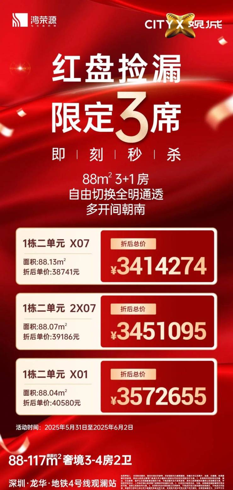 鸿荣源观城已取证!备案均价4.58万/㎡,即可开启冻资(5万),开盘享受约9折优惠,折扣为:冻资96折,认购98,开盘98,准时7天98折不延期,总共10个点。仅限开盘当天,开盘后取消98折。总价336万起