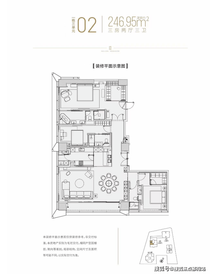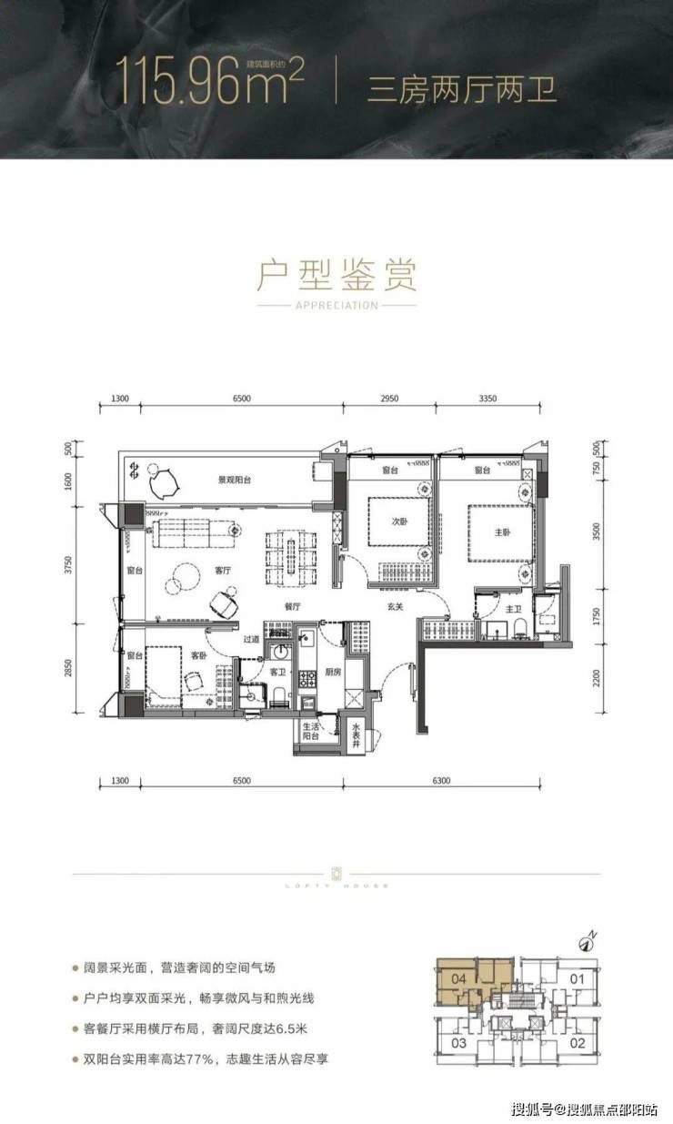 公寓有245-337㎡ 3-4房 665㎡顶复;一栋二单元为住宅项目,59层高,4梯6户,46-56层2梯2户;三单元为公寓,共41层,公寓2梯3户。