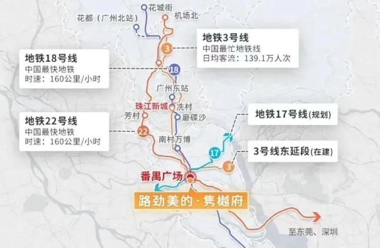 项目交通十分便捷。 3 号线番禺广场站,该站是 4 条地铁的交汇点,包括 18 号线、22 号线、3 号线以及规划中的 17 号线 。