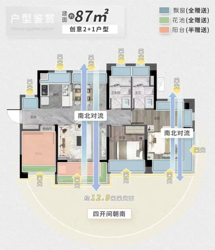 87A 户型:全小区最后一条梯腿房源,十分稀缺。四开间朝南,南北通透,约 3.8m 奢阔横厅,LDK 一体化设计。主卧配 L 型飘窗,270° 观景,可尽览园林美景,享受望江揽园的静谧生活。