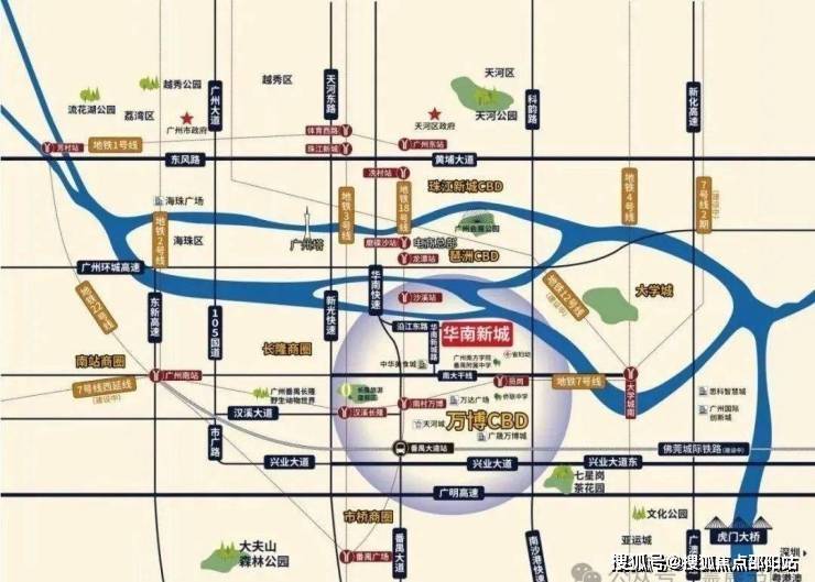华南新城位于番禺区北部,临江靠山,西临华南快线,东与大学城隔江相望,北临珠江,南面是兴南大道和万博CBD。同时合生系在周边仍有大量建设用地,正在分批开发,致力以华南新城为核心,打造华南板块城市居住群。