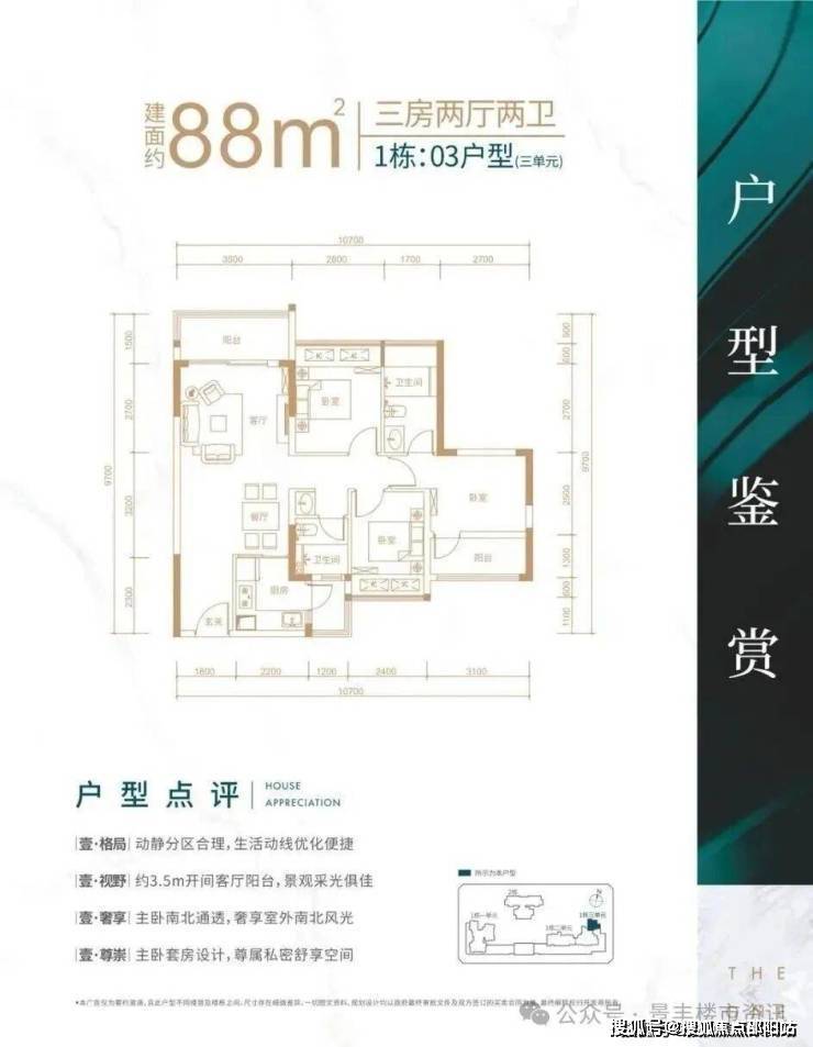 88-89㎡3房2厅2卫:动静分区布局,客厅开间大且带有阳台,主卧通透开间进深比良好。南北双次卧空间较为紧凑,居住空间通风效果较好。