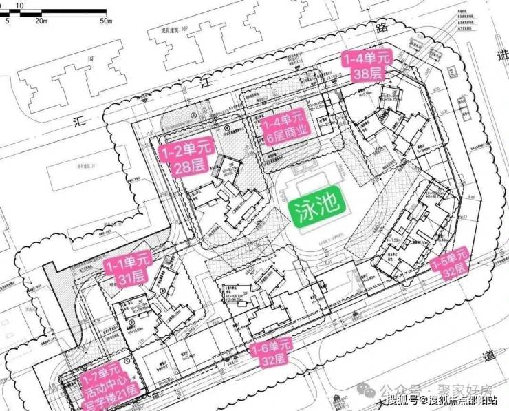 共规划建设7栋楼体,其中5栋为28-38层的高层住宅,共504户,均采用2梯4户或3梯4户的设计,另有1栋6层商业和1栋21层的办公产品,项目推出住宅产品为96-119㎡,以及133-170㎡的复式,此外小区内设有泳池配套。