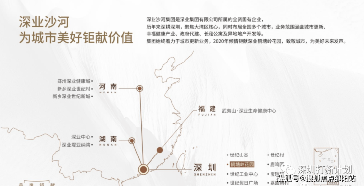 深业沙河集团是深业集团有限公司所属的全资国有企业,历年来深耕深圳,同时布局全国多个城市。始终着力于城市更新业务,2020年倾情钜献深业鹤塘岭花园,致敬城市,为美好未来发声。