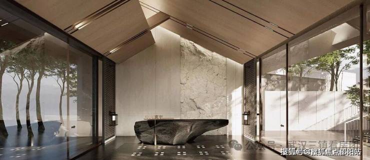 ●约6.5米空高大堂,借鉴苹果旗舰店大面积透明玻璃窗,内设会客场景及24小时管家式管理,智能电动移门无感通行。