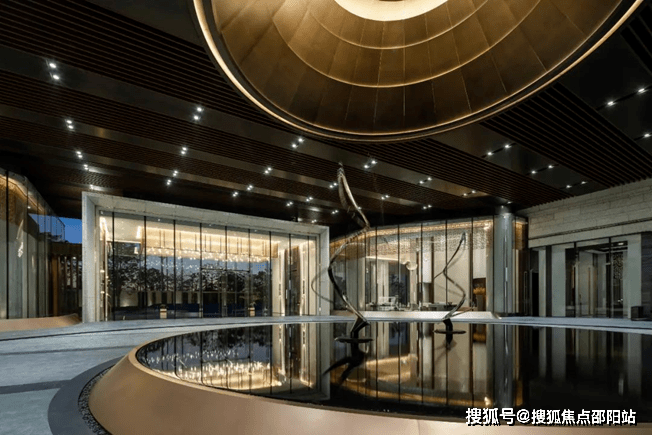 艺术雕塑之下的循环水景,倒映着的夜晚,流光溢彩,呈现如此绚丽景致的背后,是各项细节与工艺的深层考究和应用。它在设计上有个非常大的亮点,抬头看去,雕塑上方的穹顶流动了水波纹,与4楼架空层园林方形的水墨台浑然一体,同时天气晴朗时,阳光射下来,也会映射到下面的水面上,波光粼粼。象天法地,天圆地方,也象征着源源不断的财运。