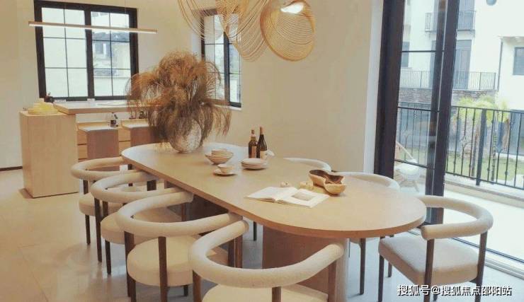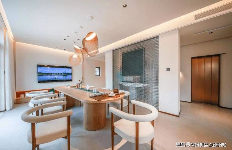 柔和的色彩纹理延伸至用餐空间,“织光有术”的创意鸟巢吊灯强调整体艺术与品质的魅力。日常三餐、节令品宴,生活的节奏流动在一方餐桌前。