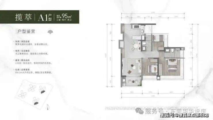 1号楼B1户型设计独特,两条腿朝向不同,西北向和西南向均有分布。虽为竖厅设计,但实现了四开间布局,一侧多个飘窗,采光极佳。户型灵活,可作三居室或四居室。打掉次卧,客厅可变宽敞大横厅,开间超6米,豪宅风范尽显。唯一遗憾是仅有一个阳台,一条腿朝北,在东莞多雨天气可能晒不到太阳。