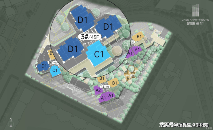 1号楼主要为入门户型,层高26层,3梯5户,建面约95-123㎡的3-4房。