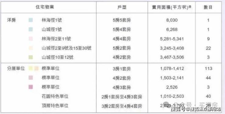 洋房实用面积:董事级独立洋房共2个包括5房4套及5房5套实用面积分别是6,268平方呎及8,030平方呎,独立洋房共9个全属4房4套实用面积介乎5,281至5,341平方呎,半独立排屋共25个包括3个4房2套实用面积介乎3,467至3,506平方呎及22个5房2套实用面积介乎3,245至3,408平方呎