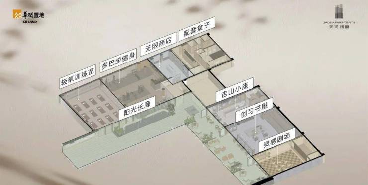 自带会所,会所经营项目功能:全龄化润心社【会所】,涵盖八大主题:轻氧训练室、多巴胺健身、无限商店、配套盒子、阳光长廊、吉山小座、创习书屋、灵感剧场。