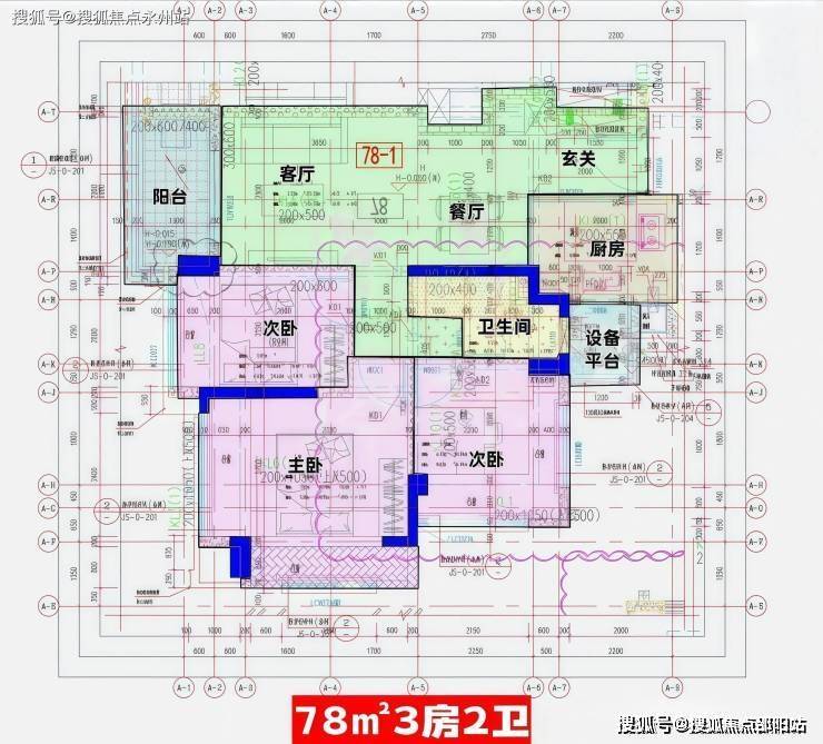 78㎡3房2厅1卫:经典竖厅设计,客厅开间3.3米,LDKB 一体化布局,S墙预留冰箱位,动静分区明确。