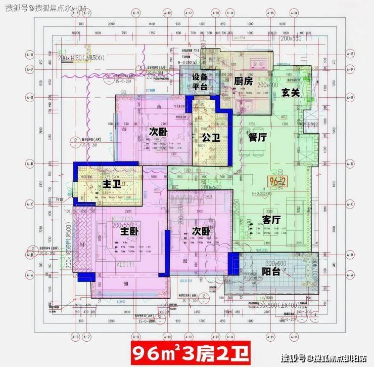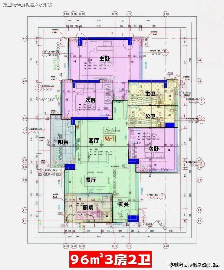 96㎡的3房2厅2卫(1),设计的是经典竖厅格局,进门入户玄关,客厅3.7米开间,LDKB一体化,S墙设计预留冰箱卡槽位,动静分区