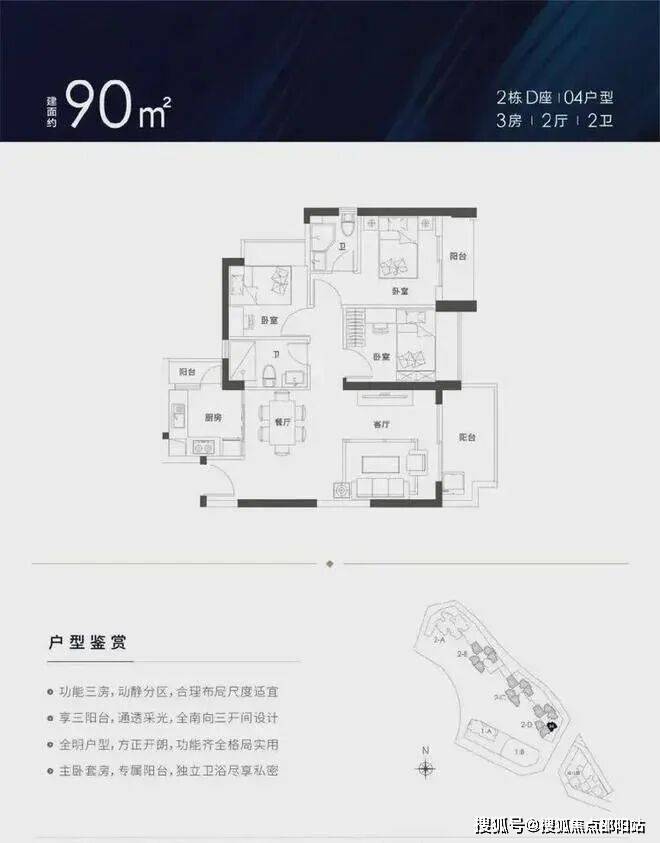 91㎡的3房2厅2卫,设计的经典竖厅格局,客厅主卧双阳台设计,厨房也带小阳台,三开间朝南,客厅朝西南向,有1个2栋D座03户型非常类似,客厅朝东北向。