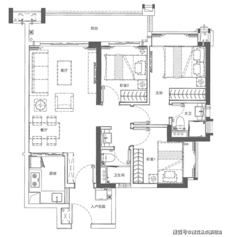 96㎡3房2卫,超宽楼距,视野开阔采光优越,餐客厅一体化,连通观景阳台,户型方正实用。