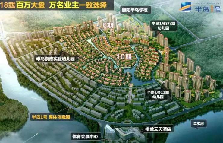 半岛1号位于粤港澳大湾区惠州惠阳中心区,毗邻惠阳区政府,天然淡水河在旁、半岛文化体育公园,高尔夫球场,城市绿肺相拥。城芯稀缺,235-399㎡湖岛院墅低密18载大城,城央唯一低密住区书香邻距离,九年制公立半岛学校生态百万方体育公园,棕榈岛高尔夫生活1公里天虹商场、三和医院等配套。
