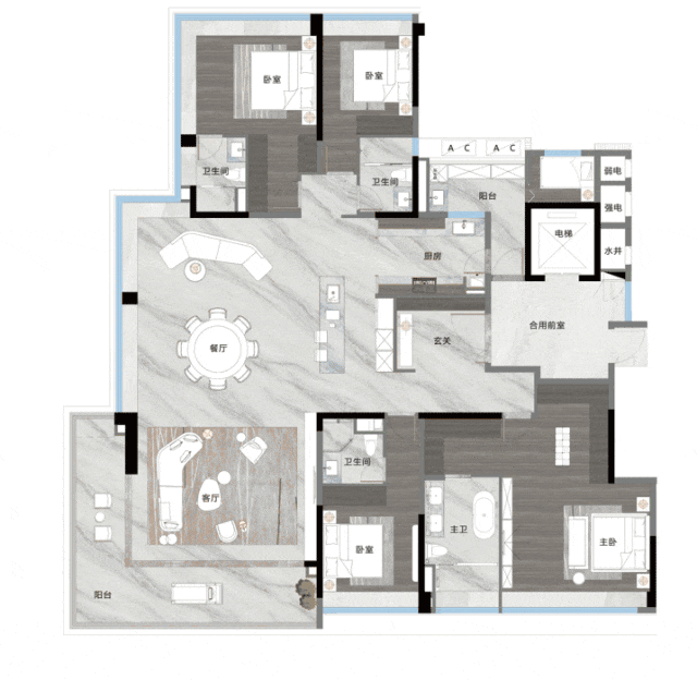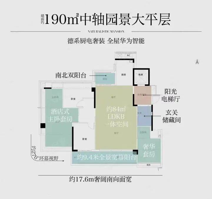 越秀·观樾建面约250㎡户型,最亮眼的是约122㎡、LDKG一体化无界超聚边厅,高效聚合生活场景。