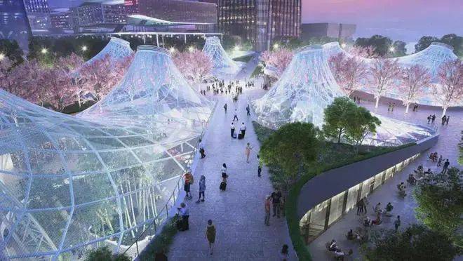 夜景光影与相交的花旗木大道配合,打造极具设计感的车站广场空间。