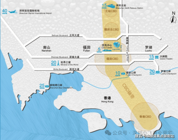 轨道口岸:享福田、皇岗双口岸,联动福田站、深圳北站双高铁,链接深港,对话世界。