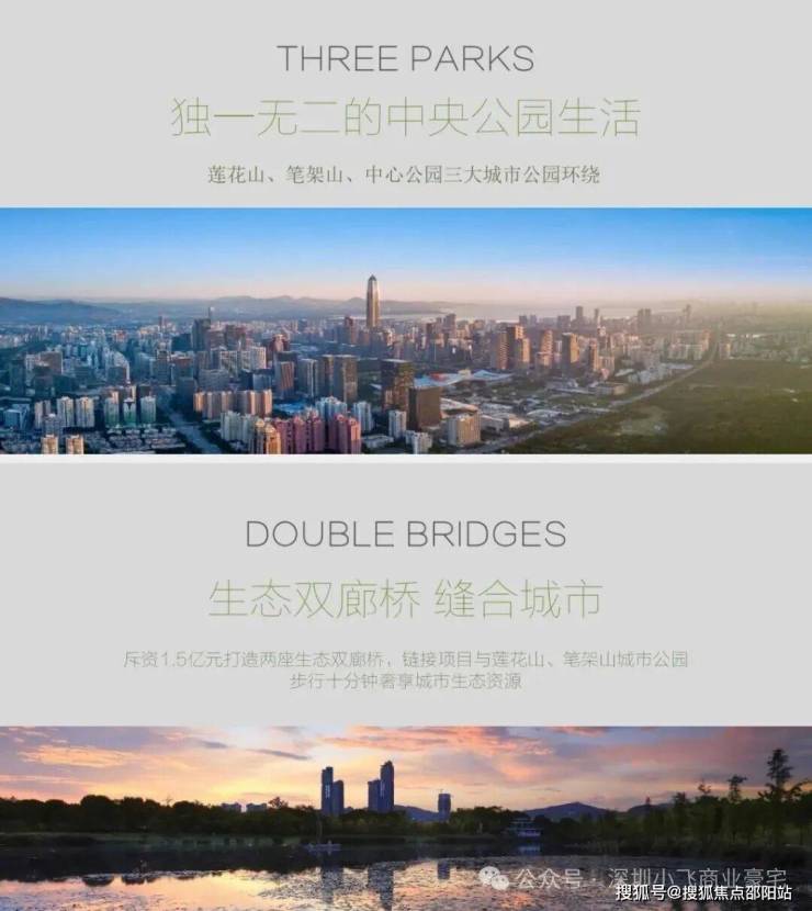 北眺塘朗山景,南临笋岗西路和中心公园,东临皇岗路和笔架山公园,西临彩田路和莲花山公园;两座大型生态连接绿道,如纽带般将莲花山、笔架山和项目相连接,使业主步行十分钟即可到达公园。