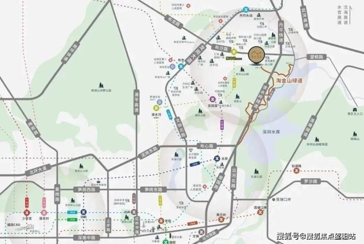约200米直线距离到淘金山绿道,沿线共13个景观节点,起于翠湖社区公园,终至沙湾路,分为映彩华章、山林野趣、山湖叠翠和绿廊揽胜四个主题段,可俯揽深圳水库、远眺梧桐山。近邻求水山公园、樟树布公园,举步自然的浓荫谧静,成为家人休闲栖息目的地。