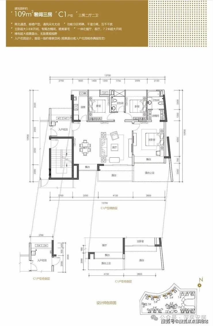 109㎡的3房2厅2卫,设计的是横厅南北通透格局,一体化餐客厅,7.2米超大开间,带大入户花园,主卧3.8米开间,L型厨房。