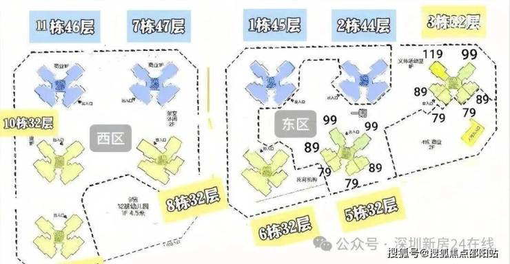 西区:占地2.2万㎡,容积率5.16,包含住宅、商业、幼儿园学校和其它基础配套设施。7栋47F,11栋46F,3T6户;8/9/10栋32F,2T5户。