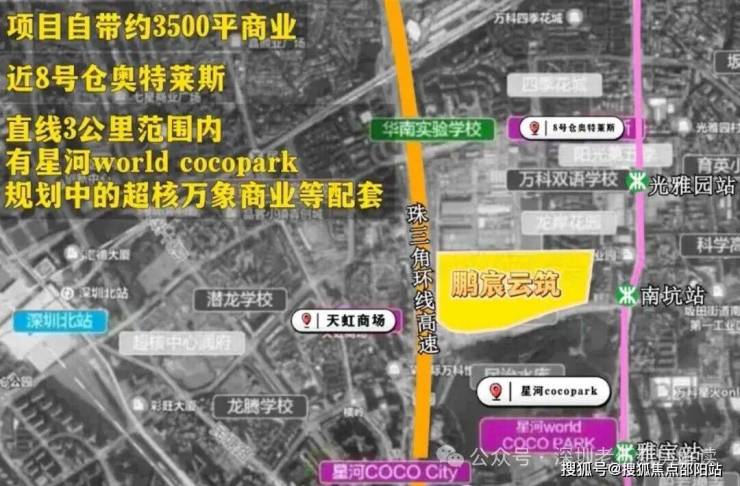 中建鹏宸云筑500米范围内有8号仓奥特莱斯,在1.5公里范围内还有龙华印象汇、星河coco city、星河cocopaek,天虹商场等商业综合体,举步即是繁华。