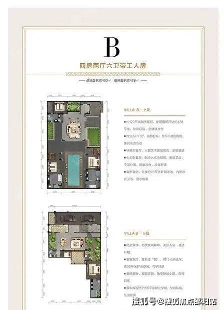 上层:惊艳延展,使用面积可达340㎡,独立入户门厅,郎阔会客厅,双卧套房,泳池庭院。下层:舒适景梯,连通上下,约32㎡上挑空庭院,动静分区,安静客卧接通花园庭院,私家车库。