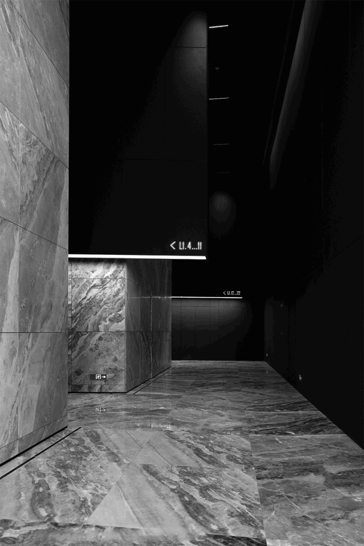 值得提及的是:一楼大堂以美术馆空间为设计灵感,辅以部分云涧灰大理石点缀。转入电梯间吊顶长廊那段,特别精彩。▽