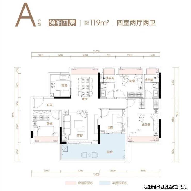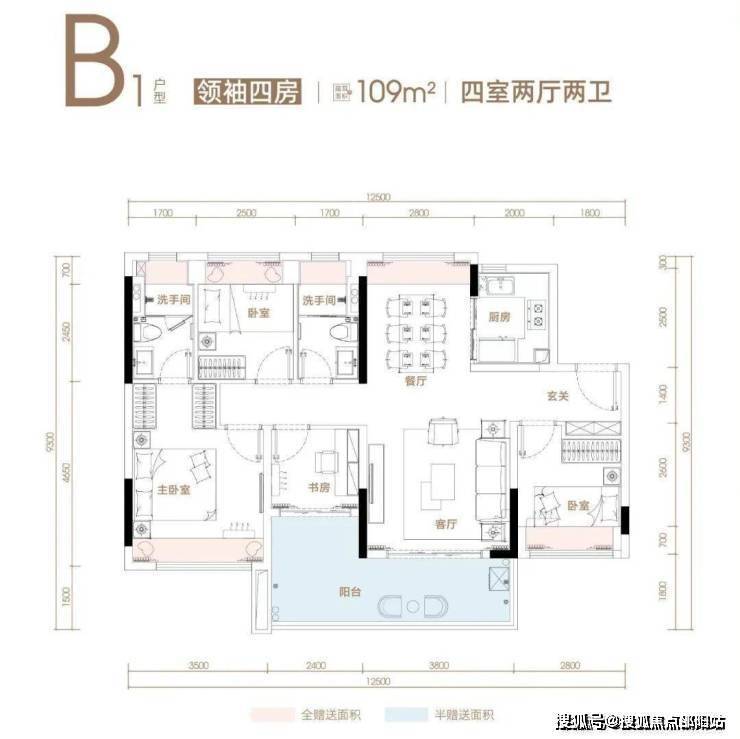 (1)109㎡四房两卫方正户型,连接景观阳台,办公学习环境更加舒适: